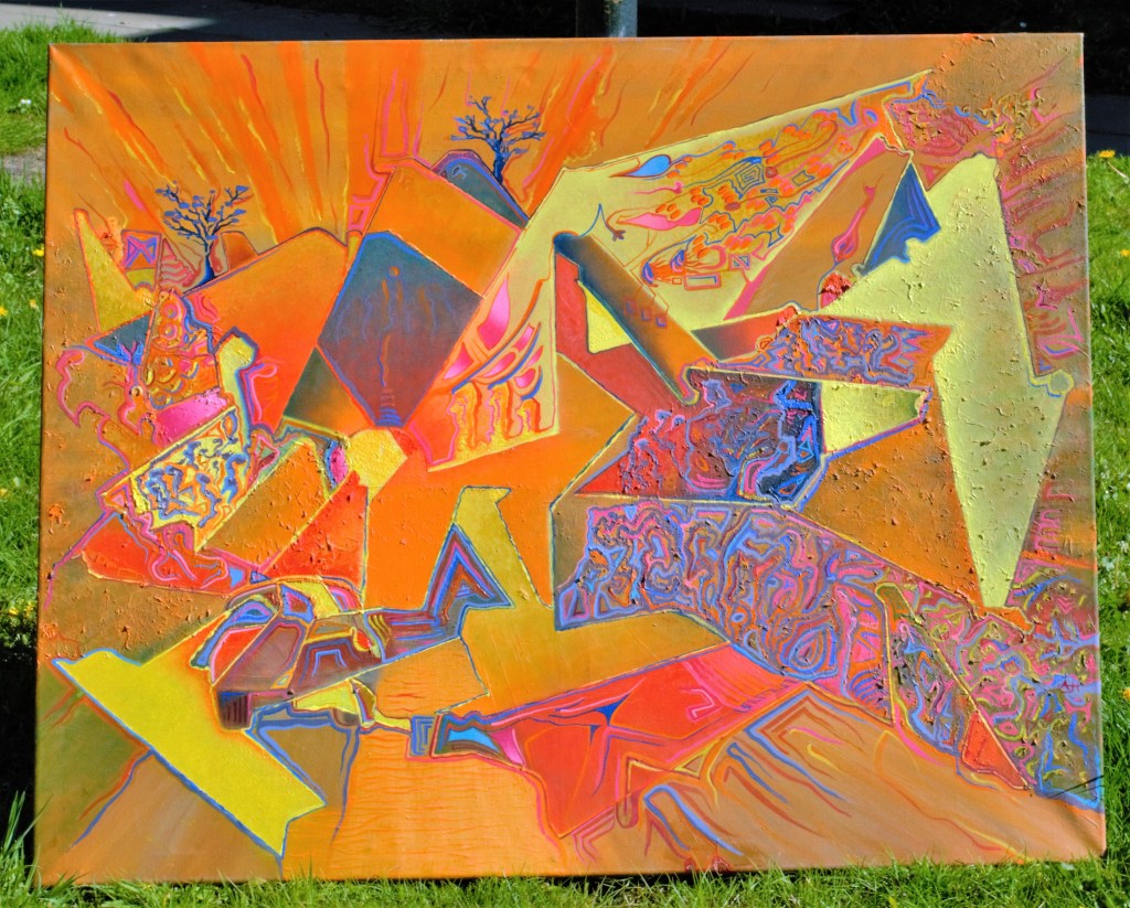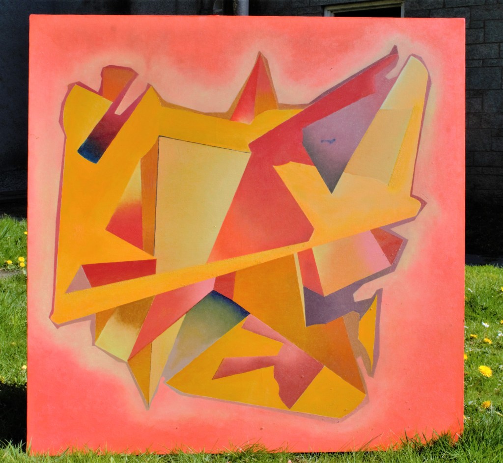 The second painting has no outside influences. The original sketch was of diving on the A96 between the two Inverurie roundabouts on the one day a year the sun sets atop of the road. There’s a lot more random mark-making in it too. This relates to a later form of abstraction where I outline rather than repair inconsistencies in the painting. In a sense, I’ve come to terms with brain damage and make use of it in a constructive way.