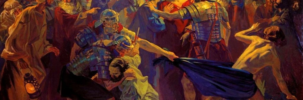 Already hearing my wife’s displeasure for my failure in my ears (she is awfully fond and fretful of her sister) I made my way a little distance behind them. Jesus and a few of his men made their way beyond the city walls to garden, where it seemed to my surprise that our apparent saviour was in some distress. Not seeing the moment as appropriate to make my petition, I held back further, and watched as he sent up cries of anguish, and upon reapproaching his men, rebuked them, for they had fallen into slumber. At last, the tension seemed to clear, and I felt free to make my approach. To my horror, however, once I had made my way onto the open road, I found myself not only in front the man whom I had sought, but also a patrol of Roman soldiers, who it soon transpired had arrived to place him under arrest. I was quick to protest my insignificance in the whole affair, but the most alarming fracas soon developed in which a Roman grabbed at my outer garb, which sadly tore from my back. Given the days earlier mishaps, this left me quiet naked and some distance from my accommodation; a position that was not only humiliating but also, as I went to hide amongst the city streets, somewhat conspicuous. It was therefore with great relief that I came upon your robe drying on the line, which through unfortunate necessity as I hope you will see, I felt obliged to avail myself of.